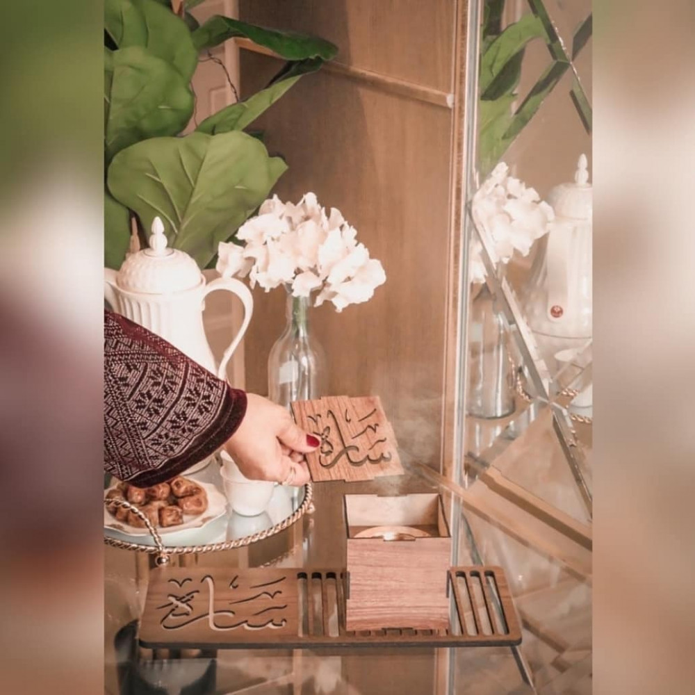 مبخرة و صينية الفخامة مصممه من الخشب بطابع انيق ليضيف لمسة فاخرة لديكور منزلك.يحتوي المنتج على مبخرة و صينية و يتم نقش الاسم على القطعتين.